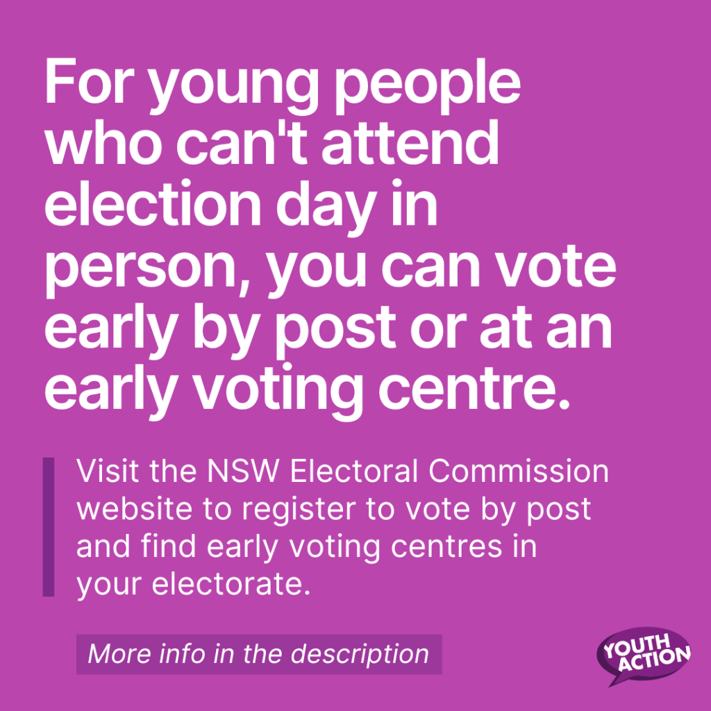 For young people who can’t attend election day in person, you can vote early by post or at an early voting centre. For more information visit the NSW Electoral Commission: https://elections.nsw.gov.au/voters/voting-options/early-voting-and-pre-polling-in-person