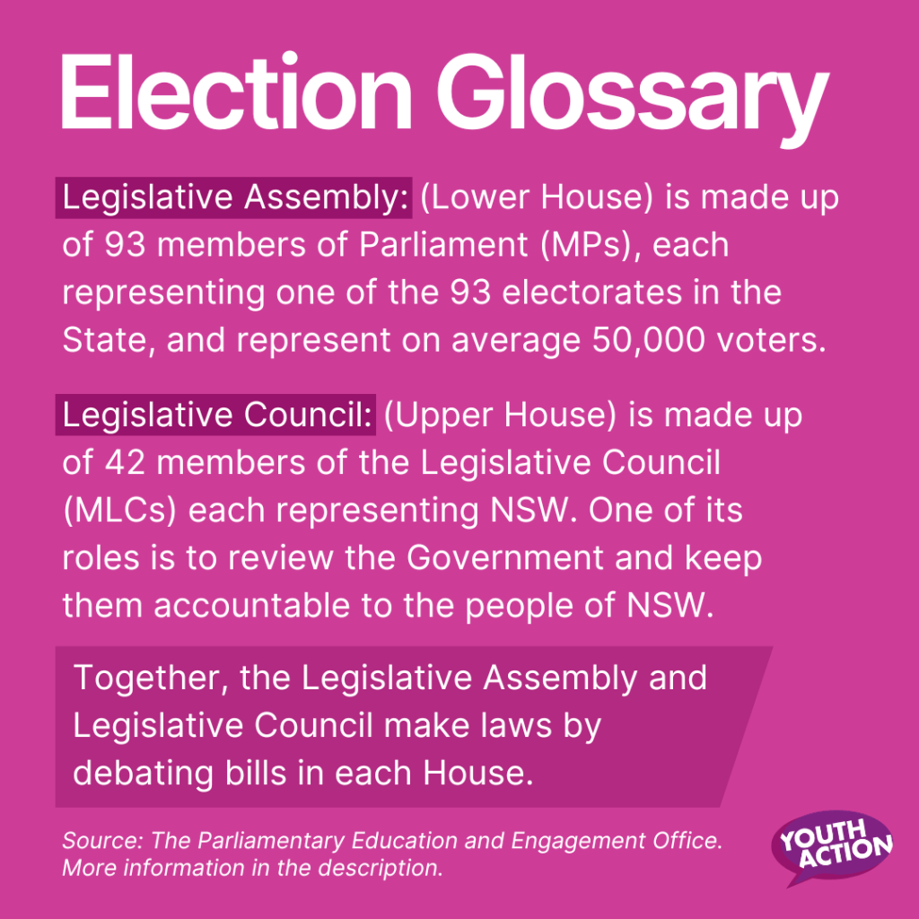 Young people want to make informed decisions about their votes this coming NSW Election. Sources use parliamentary terms that are unfamiliar to some young people, so here are the main terms they have asked for. More definitions can be found in the glossary from the Parliamentary Education and Engagement Office: https://education.parliament.nsw.gov.au/glossary/