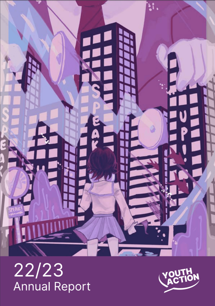 TO SPEAK UP AGAINST AUTHORITIES: As a contribution to this year’s Annual Report, I created a canvas that encapsulates the vibrant spirit of young individuals and the unwavering determination to push their voices and opinions out there, representing the resilient voices of the youth and the obstacles and surprises that will have to be overcome. The artwork takes inspiration from the dynamic selection of Youth Action’s signature colours: purple and sub-ranges of pink and blue. The hues of purple embody the strength and courage of individuals who are standing up to shape their futures, while pink and blue underscores the warmth and care that the community extends to nurture their dreams. The focal point of the artwork is the collection of vibrant speech bubbles from the microphones that float strikingly across the canvas. These speech bubbles stand as visual metaphors for the powerful voices of the youth, voices that deserve to be heard, acknowledged, and celebrated. In a deliberate choice, these speech bubbles feature an inverted colour scheme—neon aqua hues against a mostly purple background. This inversion serves as a representation of the transformative process that occurs when young voices are uplifted and empowered. The traditional norms are upturned, and the youth emerge as agents of change, driving conversations and shaping narratives. This is such a world where young individuals are often marginalised, their voices sidelined. I represented the obstacles facing and opposing them through the person in the suit, seemingly larger than then buildings. I also represented the young voices through the girl standing front and centre, facing the towering, suited giant, with many buildings and motifs to speak up, portraying the many organisations, just like Youth Action, supporting the youth and the importance of including them in dialogues that directly affect their lives and communities. The energetic and vibrant colours reflect the vitality and enthusiasm that young people bring to every endeavour. By ensuring their voices are integral to conversations about policies, services, and societal changes, we embrace a future that is truly inclusive and reflective of their needs, aspirations, and dreams. I hope that this cover serves as a visual call to action, a reminder that every hue of colour represents a story, a dream, a potential change-maker. In the coming years, may the youth’s voices resonate louder, their presence felt more profoundly, and their impact ripple through communities far and wide. Through unity and empowerment, we create a world where every voice matters, and every young individual finds the support they need to flourish.