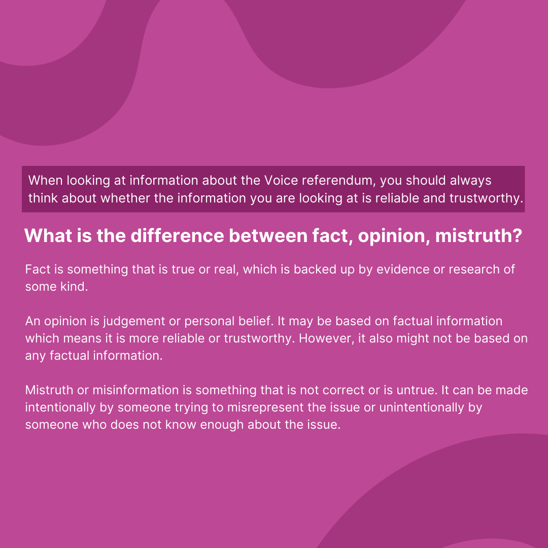 It can be difficult to tell what information on the internet is factual and what isn’t factual. Here are some things you can look for to spot if some information is not factual: emotional language, incoherence, false dilemmas, scapegoating, personal attacks, trick questions, cherry-picking. Learn more about spotting disinformation on Youth Action’s website: https://atomic-temporary-215663268.wpcomstaging.com/voice-referendum/